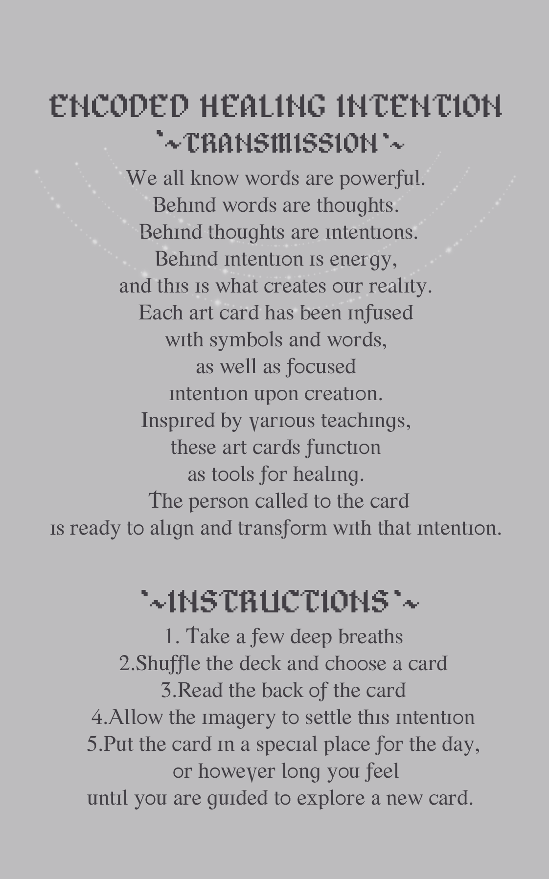 Directions: 1.Take a few deep breaths to center yourself. 2.Shuffle the deck and choose a card. 3. Read the back of the card and allow the imagery to settle this intention.4. Place the card in a special place for the day or however long you feel is necessary until you are guided to explore a new card.